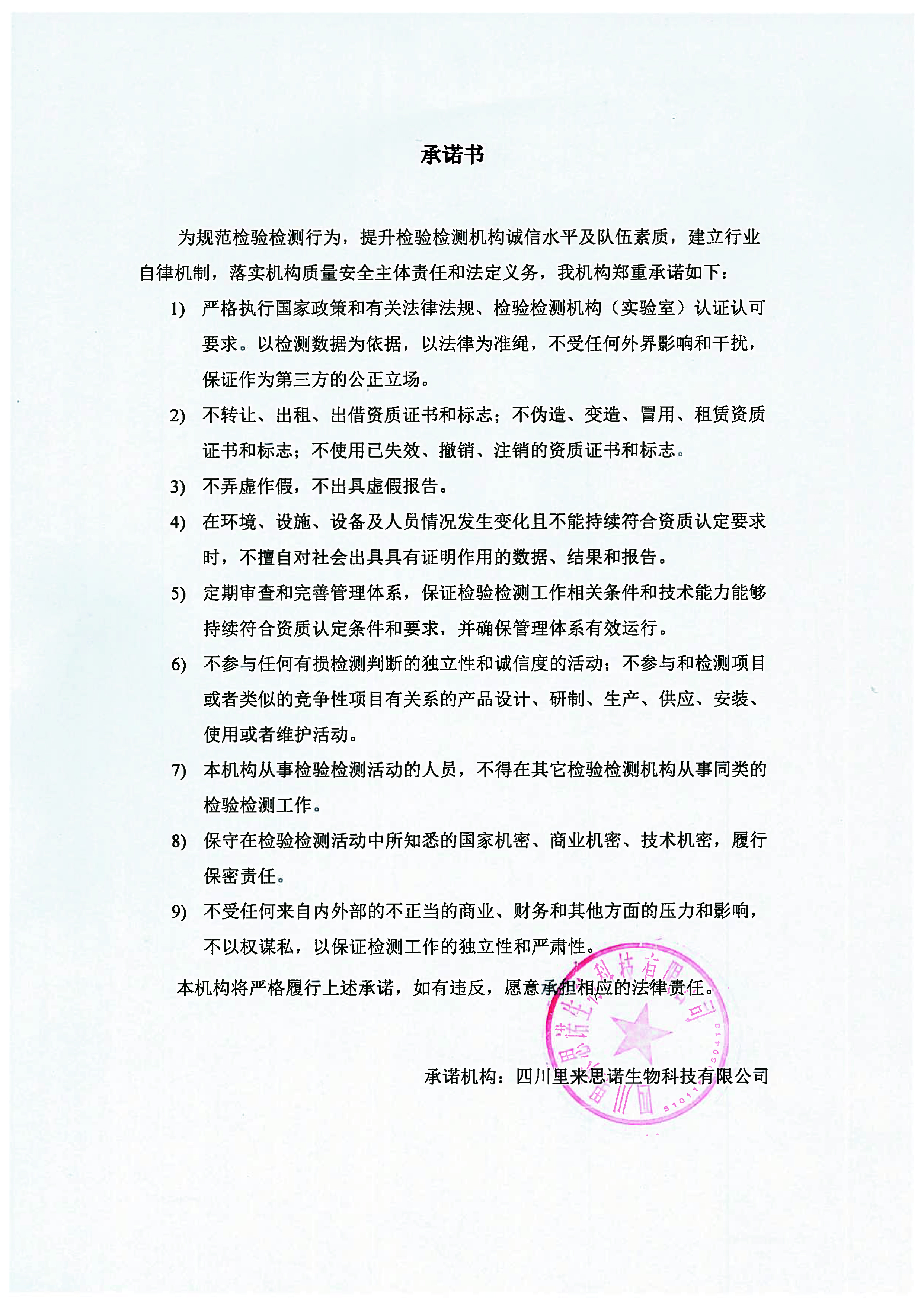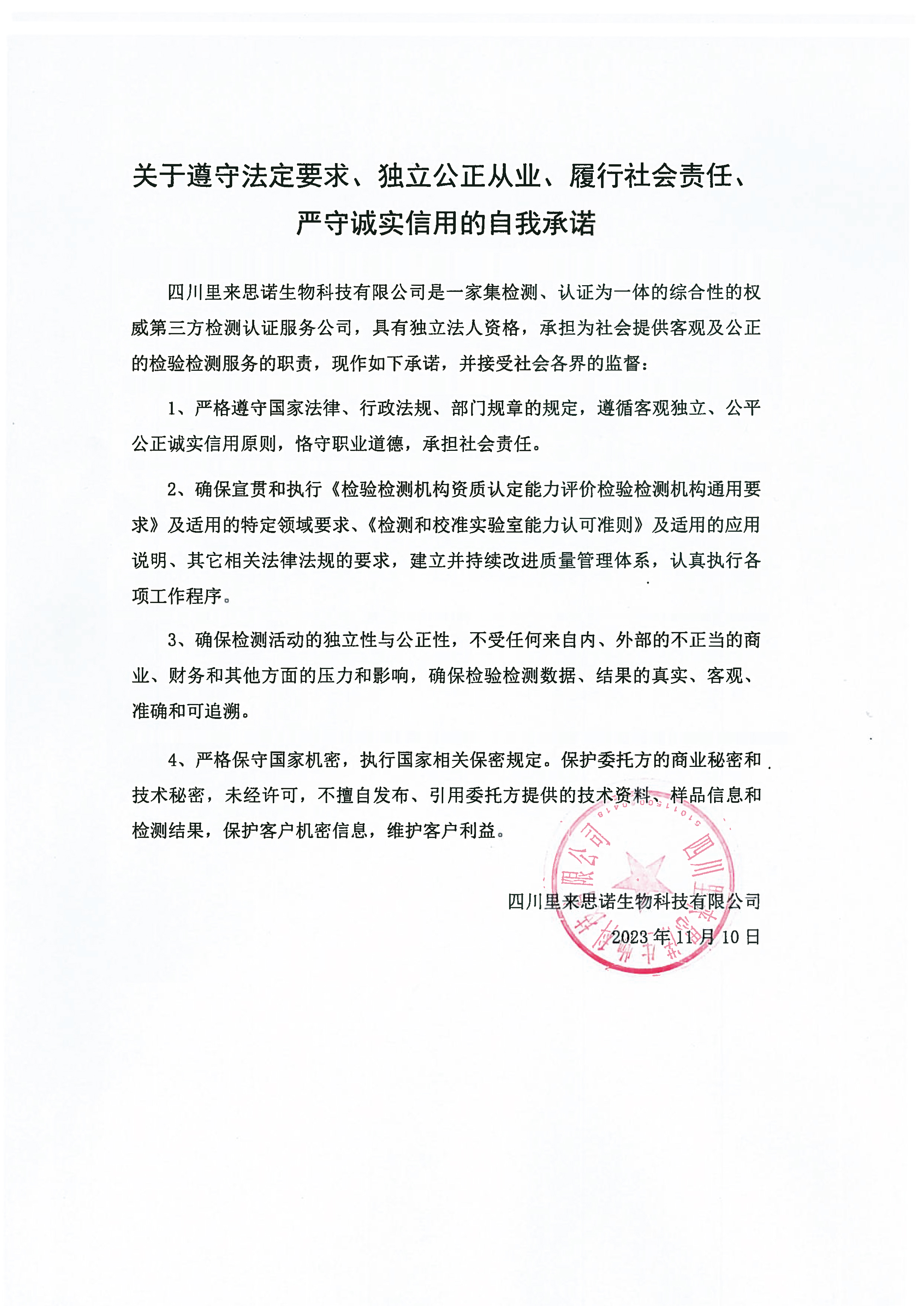 關(guān)于遵守法定要求、獨(dú)立公正從業(yè)、履行社會(huì)責(zé)任、嚴(yán)守誠(chéng)實(shí)信用的自我承諾