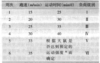 注:*,預(yù)定的運動強度是指:①大鼠連續(xù)10秒停在跑臺后1/3,聲電刺激仍止步不能向前;②大鼠連續(xù)3次臀部碰到籠具后壁并出現(xiàn)神情疲倦、腹垂位、垂頭、眼充血、呼吸急促、目光遲鈍、尾尖下垂等
