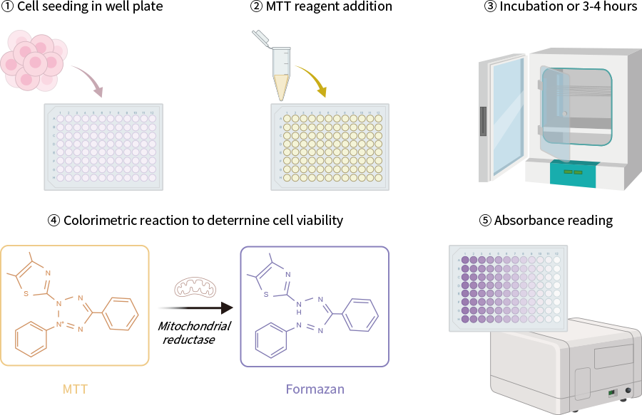 MTT即噻唑藍(lán),是一種可接受氫離子的黃色有機(jī)化合物,可以被活細(xì)胞線粒體內(nèi)的琥珀酸脫氫酶和細(xì)胞色素C等還原為不能溶于水的藍(lán)紫色產(chǎn)物甲臜(formazan)。該產(chǎn)物雖然不溶于水,但可以溶于特定溶劑(如DMSO)。